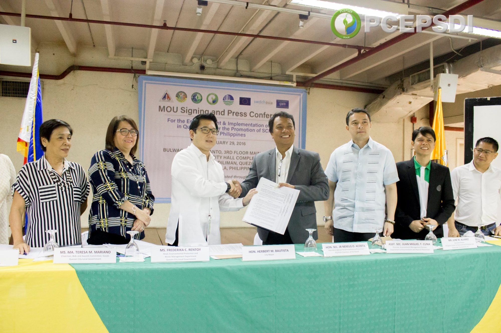 Mayor Herbert Bautista led the QC LGU, while Presidential Adviser for Environment Protection and concurrent Laguna Lake Development Authority (LLDA) General Manager Hon. Secretary Juan Romero Nereus Acosta, represented PCEPSDI as its Board Chairman. DENR Assistant Secretary and EMB Director Atty. Juan Miguel Cuna, who also sits as the Co-Chair of the National Ecolabelling Programme-Green Choice Philippines (NELP-GCP), signed as one of the partner agencies/ witnesses.